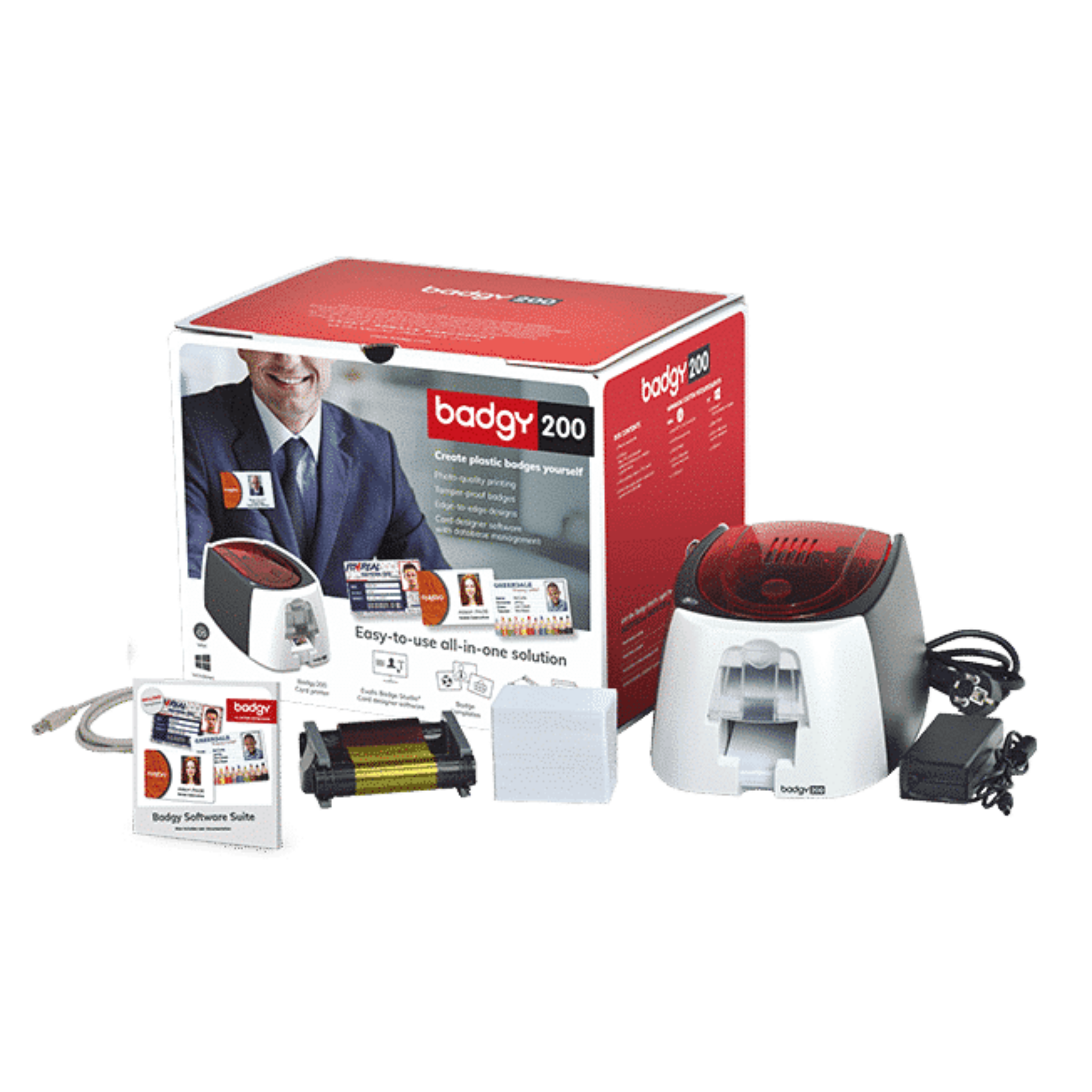 Badgy provides you with a turnkey solution, for PC or Mac, consisting of a plastic card printer, the Evolis Badge Studio® card personalization software, and a pack of consumables (color ribbon and blank plastic cards) for 100 prints.