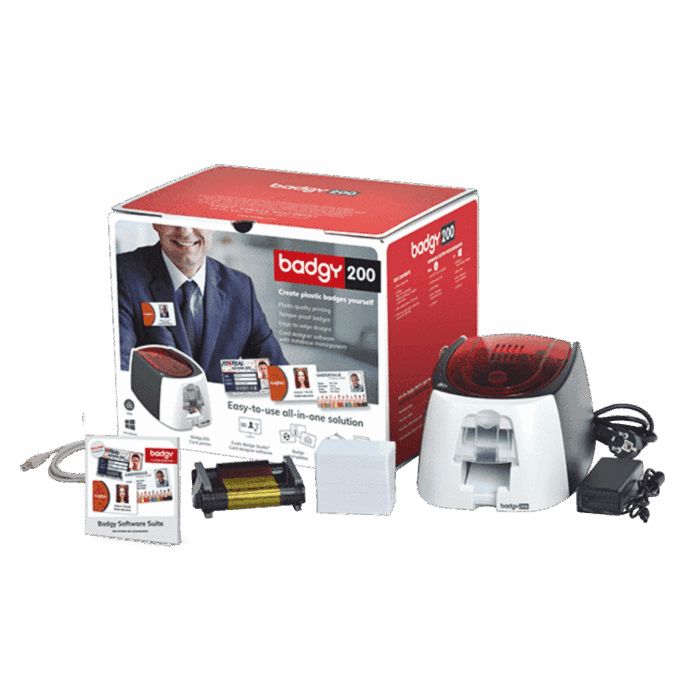 Badgy provides you with a turnkey solution, for PC or Mac, consisting of a plastic card printer, the Evolis Badge Studio® card personalization software, and a pack of consumables (color ribbon and blank plastic cards) for 100 prints.